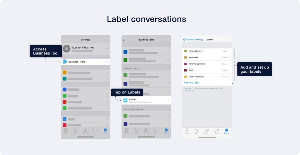 - Memberi label pada percakapan: Fitur memberi label pada percakapan memungkinkan Anda untuk dengan mudah mengkategorikan percakapan ke dalam berbagai label, sehingga Anda dapat dengan cepat mengidentifikasi jenis percakapan dan meresponsnya dengan tepat. Label seperti pelanggan baru , keluhan , pelanggan setia , atau mendesak dapat sangat berguna, terutama saat membuat daftar untuk siaran (lebih lanjut tentang itu sebentar lagi!).