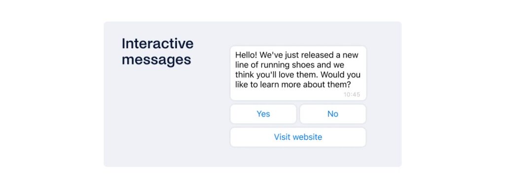 1. Pesan interaktif: Anda tidak hanya dapat mengirim pesan dengan cepat, tetapi Anda juga dapat membuat tombol balasan cepat yang merevolusi cara Anda berkomunikasi dengan pengguna. Yang perlu dilakukan pengguna hanyalah mengetuk balasan pilihan mereka dan balasan tersebut akan langsung dikirim kembali kepada Anda—memungkinkan Anda untuk membalas secara efisien dan memfasilitasi keterlibatan terbaik.