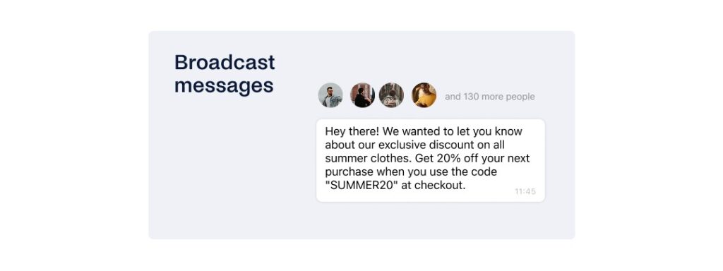- Broadcast : Jika Anda ingin menyampaikan pesan Anda kepada khalayak luas, maka kampanye pesan teks adalah solusi yang tepat. Namun perlu diingat bahwa WhatsApp Business membatasi siaran hingga 256 kontak. Untuk mengirim siaran, Anda dapat memilih secara manual dari daftar kontak Anda atau memilih label yang telah Anda buat. Penerima harus menyimpan nomor telepon Anda agar dapat menerima siaran—jika tidak, siaran tidak akan berfungsi.